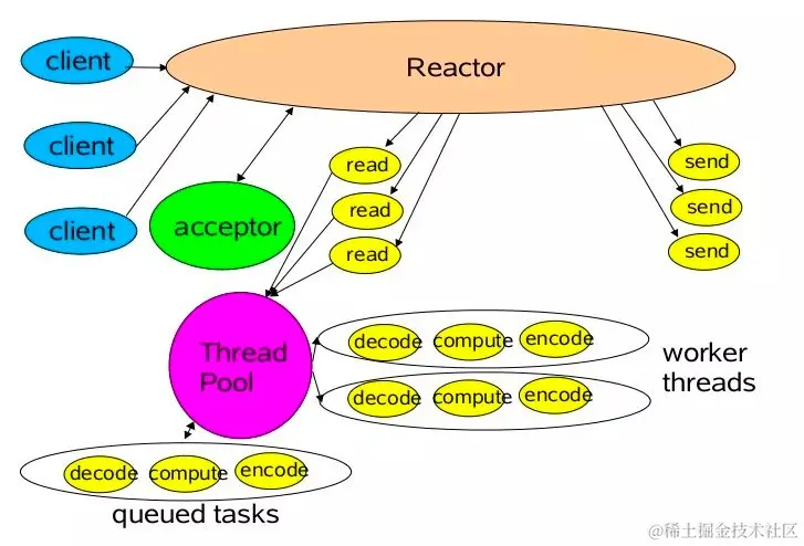 相对于第一种模型来说,在处理业务逻辑,也就是获取到 IO 的读写事件之后,交由线程池来处理,handler 收到响应后通过 send 将响应结果返回给客户端。这样可以降低 Reactor 的性能开销,从而更专注的做事件分发工作了,提升整个应用的吞吐。