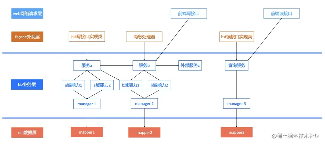 - facade层的hsf实现类只做简单的参数校验和转化,不要写业务逻辑。