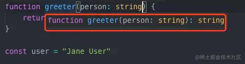 此时我们可以看到,greeter函数自动加上了返回值类型,这是 TypeScript 自带的类型推导。