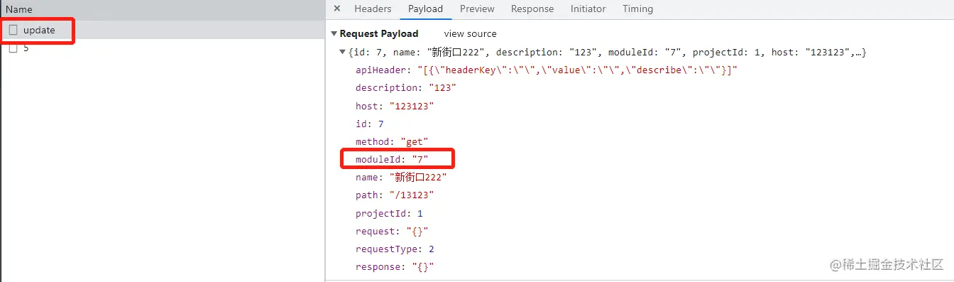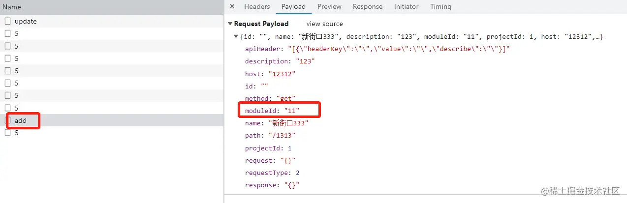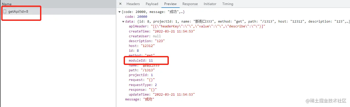 F12 查看打开编辑调用的接口,发现接口返回里有了 moduleId 。