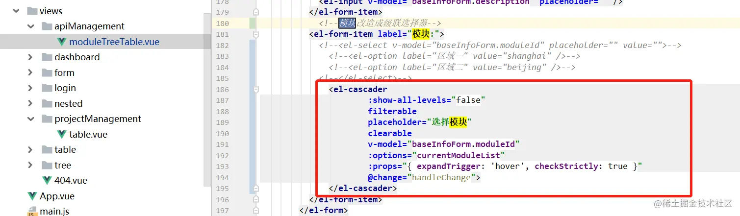 后端数据有了,下面改前端,找到编辑页面里的对应位置,原来的内容是我临时放置的一个下拉选择框(图中被注释部分),现在用级联组件的内容(红框部分)替换上去。