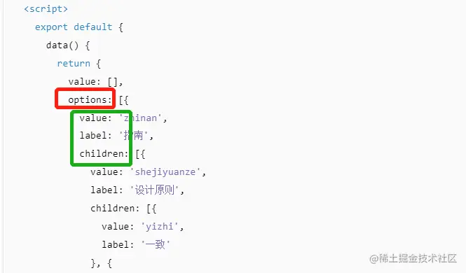 查看组件属性得知所需的数据内容,value用于存放选择的节点,注意这里存进去的是数组。而options就是数据源来,也是一个数组,里面的属性有: