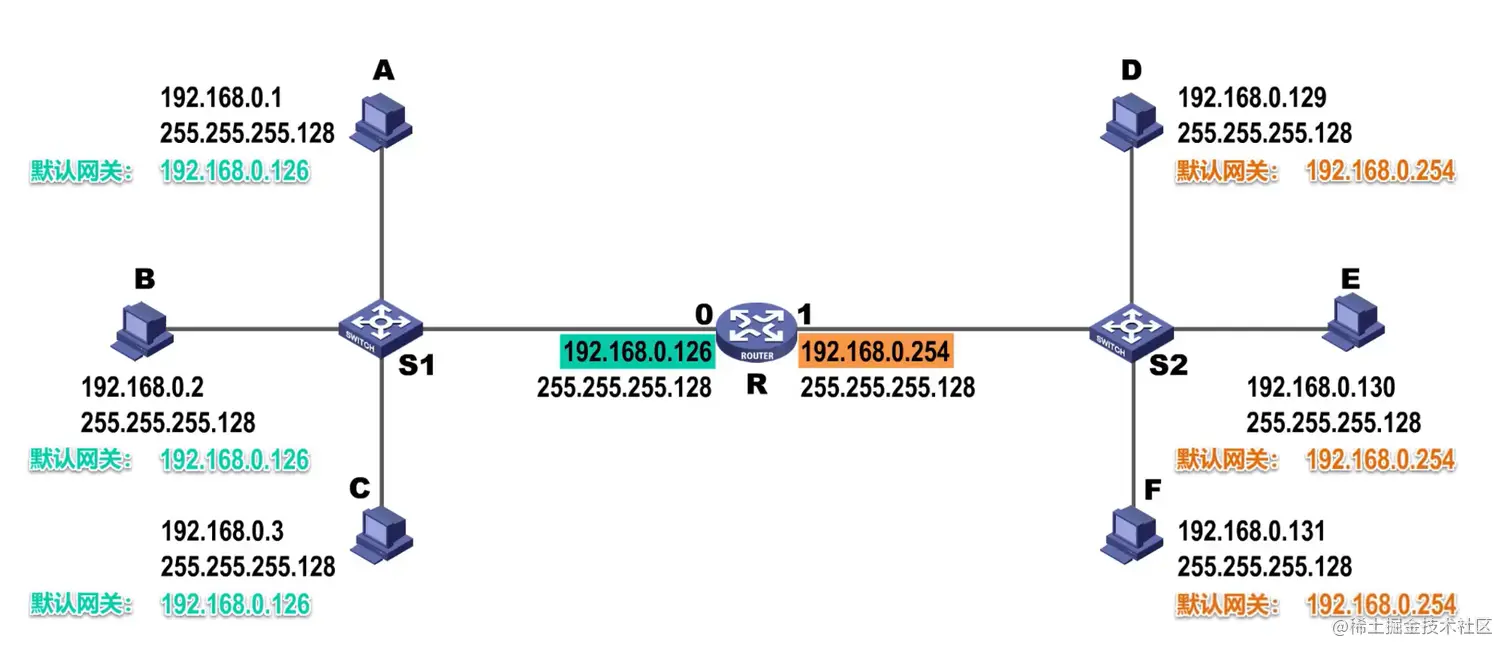 例如,路由器的接口0的IP地址192.168.0.128做为左边网络的默认网关