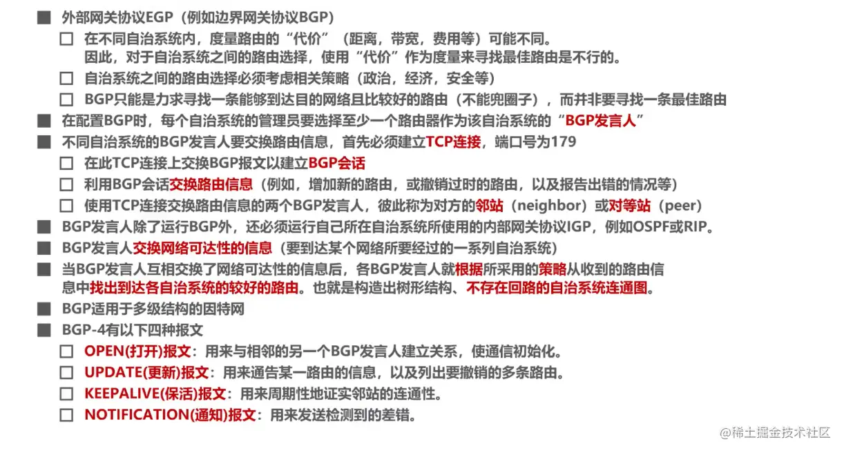 BGP(Border Gateway Protocol) 是不同自治系统的路由器之间交换路由信息的协议,属于 EGP