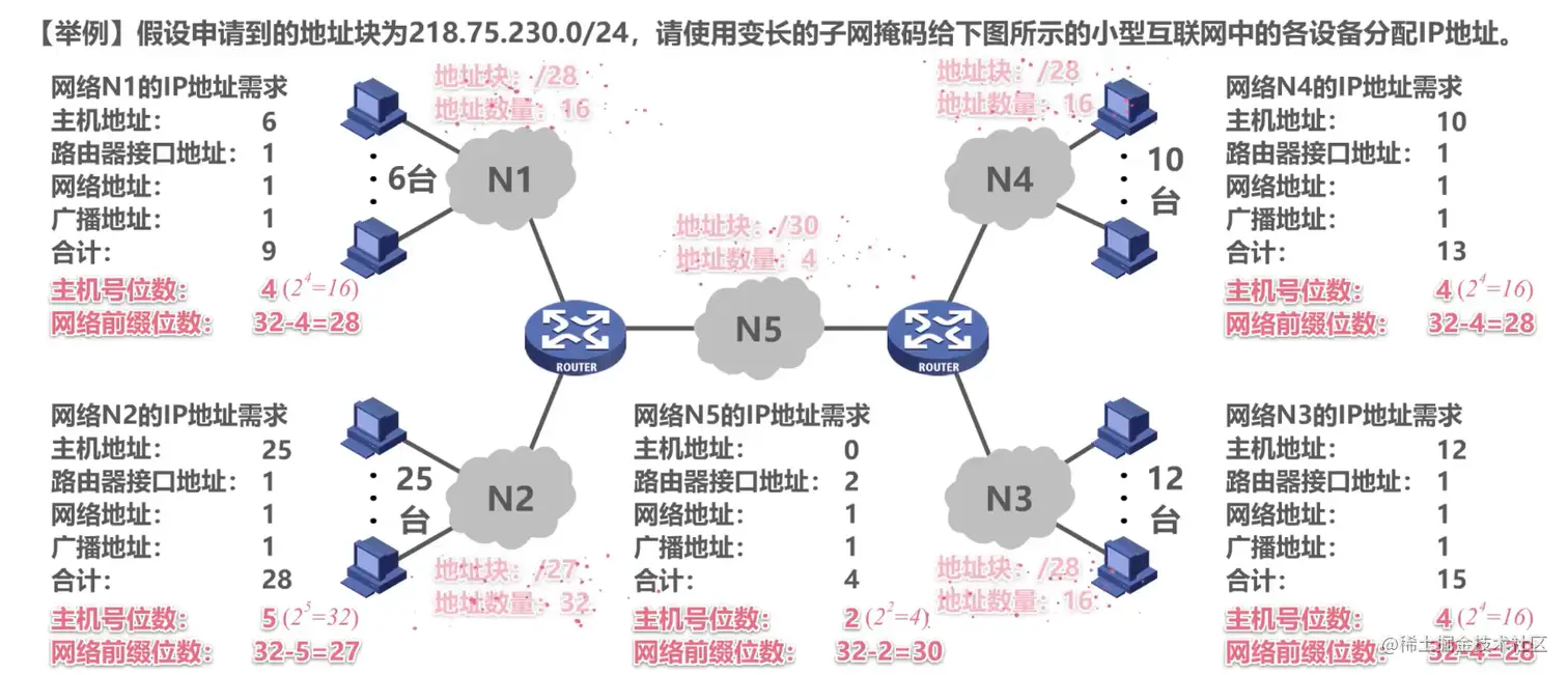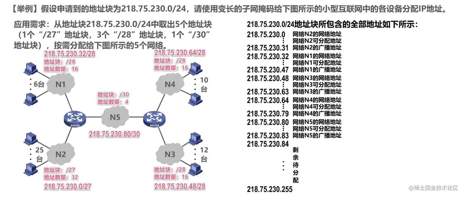 分析各子网需求,N1到N5 分别需要分配前缀为 "/28" "/27" "/28" "/28" "/30" 的子网块,即分别要地址大小为 16、32、16、16、4的地址块,于是动态地将各子网地址紧密地划分: