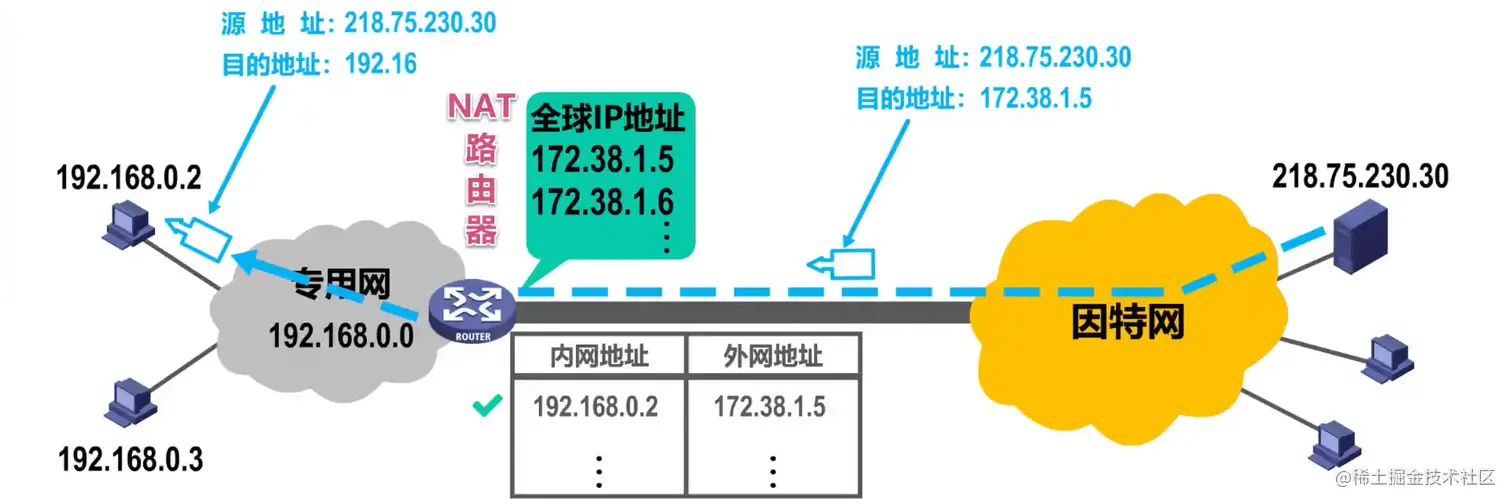 装有NAT软件的路由器叫做 NAT路由器, 至少有一个有效的外部全球IP地址,所有使用私有地址的主机在和外界通信时,都要在NAT路由器上将其私有地址转换为全球IP地址