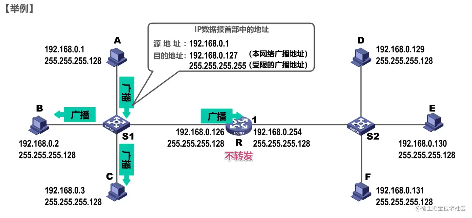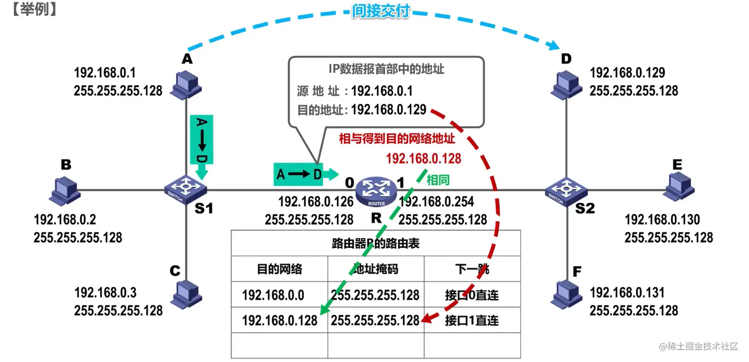 目的网络地址和源网络地址 不相同,就不在同一个网络中,属于间接交付,传输给主机所在网络的默认网关(路由器),由默认网关帮忙转发