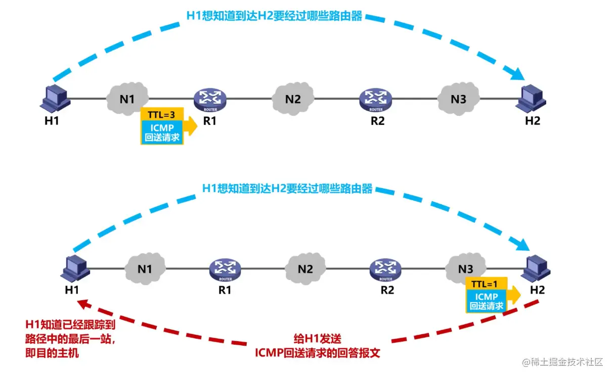实现原理:先对路径第一个路由器发TTL=1 的回送请求,得第一个路由器;同理最后得目的主机