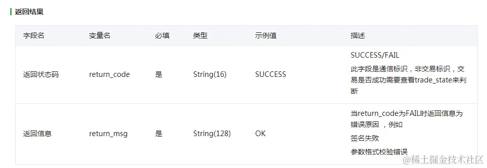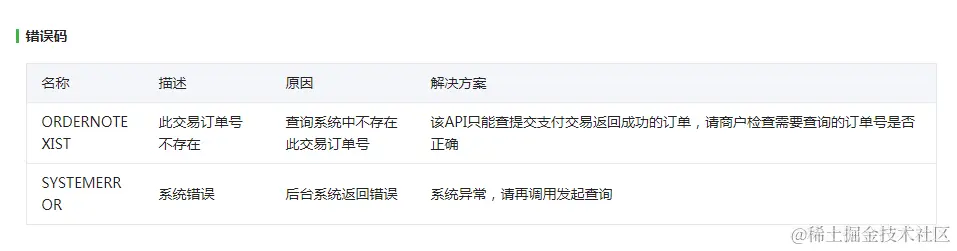 入参是接口请求所需要的变量参数,其中包括必填参数和非必填参数,非必填并非是可以忽略的,比如上面的入参中,签名类型为非必填,如果未传此参数,则默认此签名类型为MD5,如果使用的并非此类签名类型,则此项为必填项。如果是普通订单查询,入参时间非必填,则返回结果是用户全部订单,或者用户特定时间订单的区别。