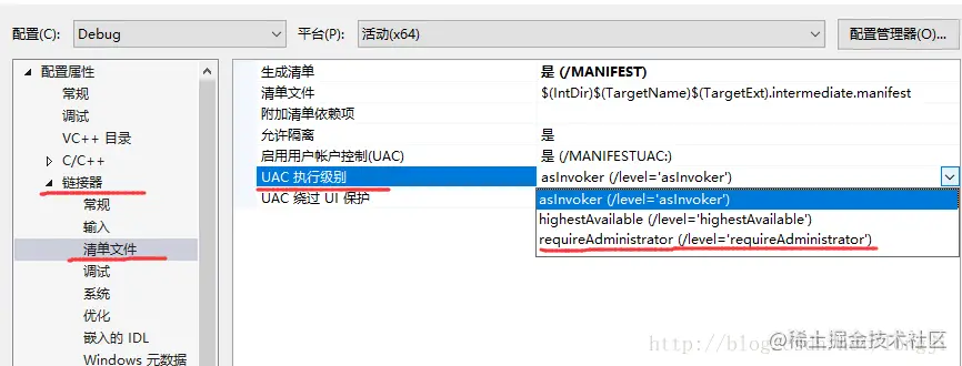 即vs工程的配置属性=>清单文件=>UAC执行级别=>选则requireAdministrator(/level='requireAdministrator')