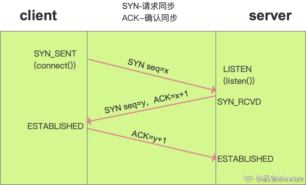- 第三次握手:客户端收到服务器的SYN+ACK包,向服务器发送确认包ACK(y+1),此包发送完毕,客户端和服务器进入ESTABLISHED(TCP连接成功)状态,完成三次握手。客户端与服务器才正式开始传输数据。