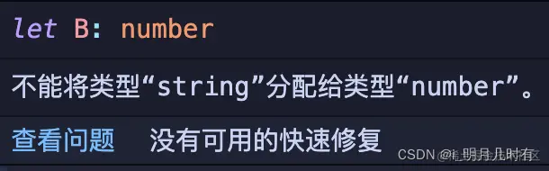 当你没有定义 变量类型的时候,ts会在你给变量赋值的时候隐式的帮你声明,如下图我并没有声明变量B的类型,却会再我准备给B再次赋值的时候提示我:
