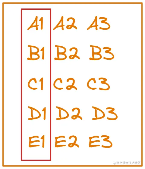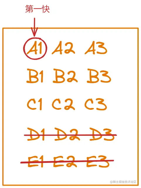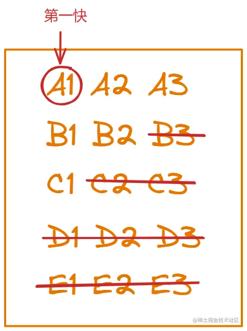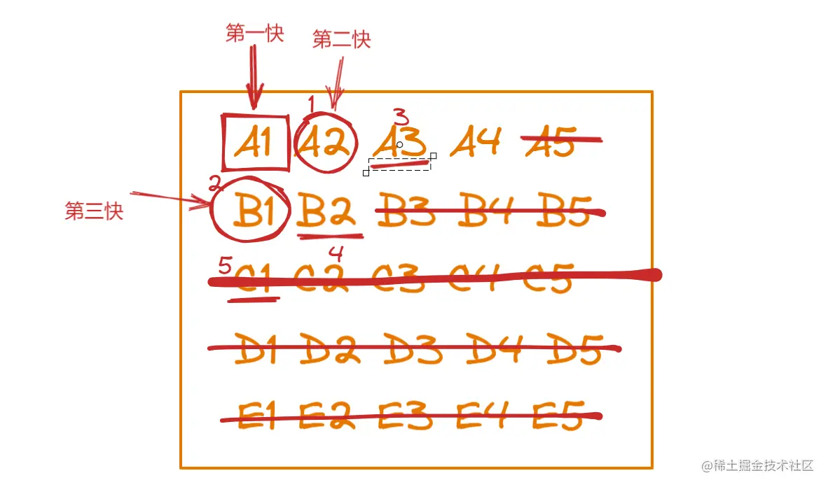 按照题目的要求呢,我们只需要找出最快的三匹马就行了,所以在下一次比赛之前,我们可以先把肯定不会被选上的马淘汰掉,因为我们已经知道每组内5匹马的快慢了,现在只有三个名额,跑的最慢的两匹马肯定是可以淘汰掉了,这样一来,我们现在要考虑的范围就是每一组前三快的马,如下图所示