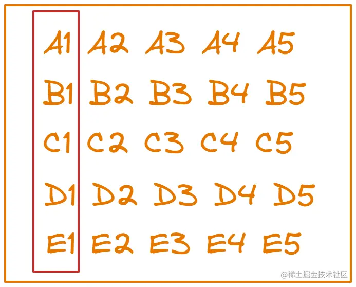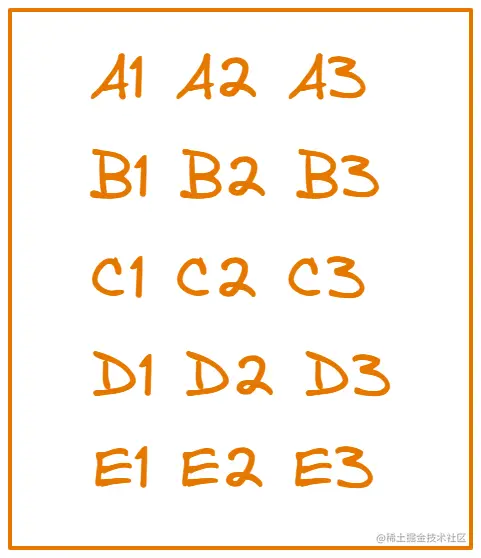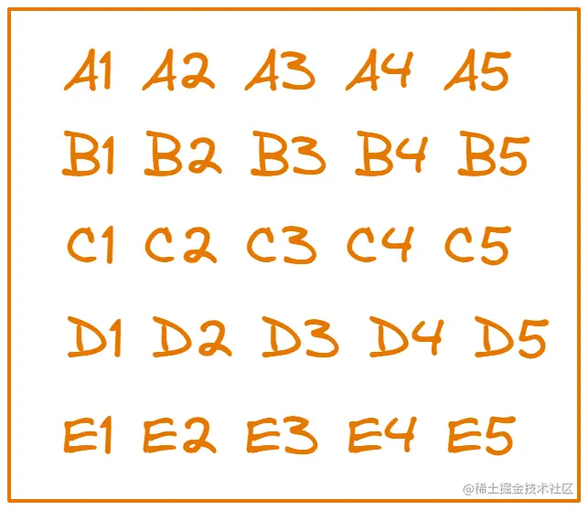 我们一开始并不知道这25匹马中谁快谁慢,所以需要筛选出那些跑的较快的马出来去竞争前三名,只能将25匹马随机进行分组比赛,然后按照这些马的快慢情况进行排序,同一个字母代表是同一组的马,对应的下标代表他们在该组的排名,下图是我们在比赛5次之后给25匹马做的一个排序
