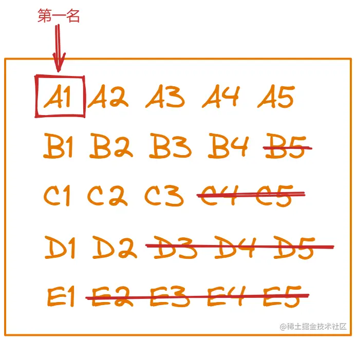在A1-E1的比赛当中,我们已经选出了最快的马,这里我们认为A1最快就行,因为无论是哪匹马都不会影响最终的结果,他们的快慢关系姑且认为从快到慢就是A1-E1。我们现在还差第二快和第三快的马没有找出,也就是还有两个名额,那么B1和C1作为上次比赛的二三名还是有机会去争夺25匹马中的第二第三名的,但是D1和E1完全就没有机会了,因为他们落后于B1和C1,于此同时,D1和E1又是它们自己组中跑的最快的马,所以这两组其实就可以完全淘汰掉了