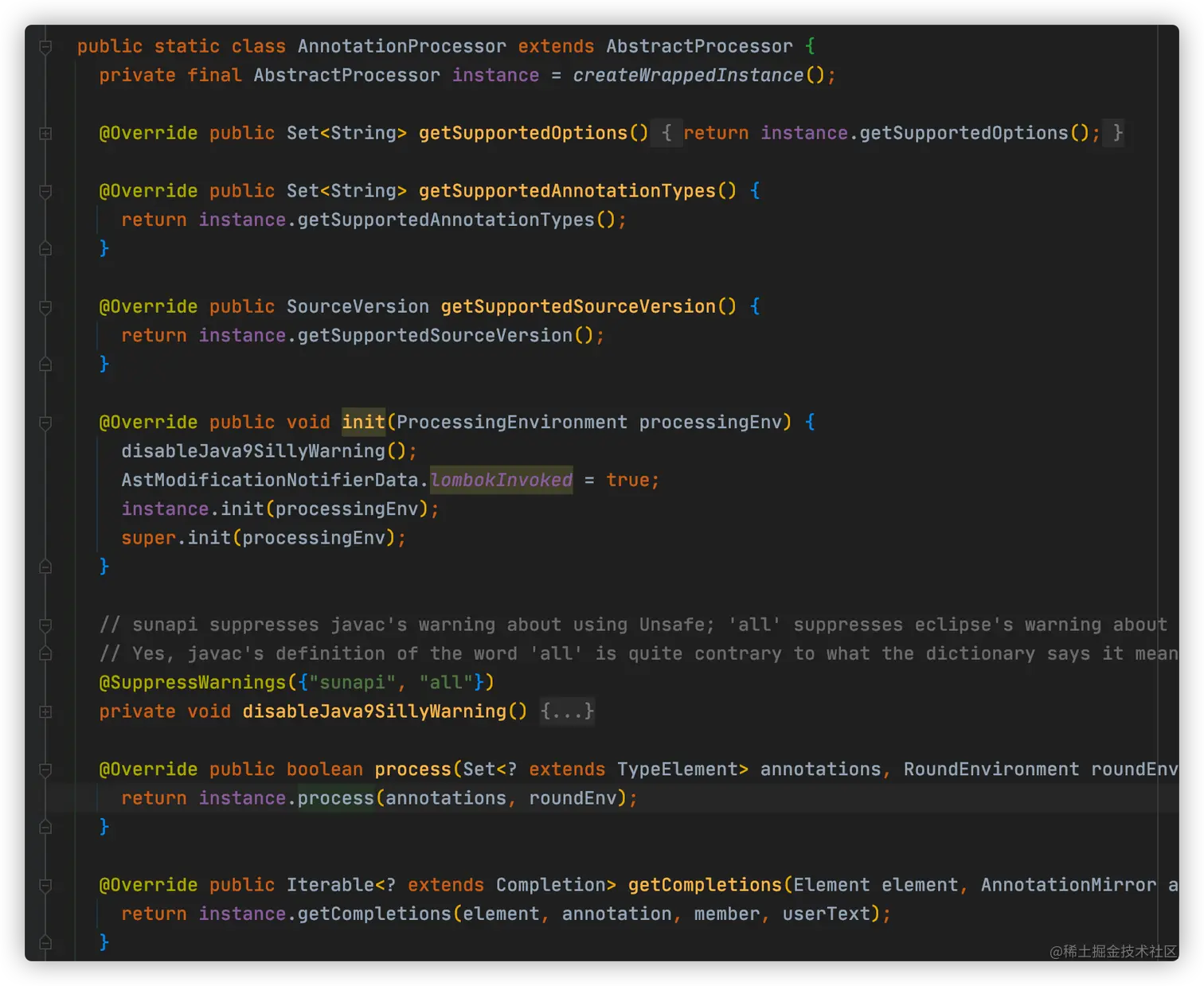 通常来说,当编写注解处理器时,我们不声明任何构造器,并依赖于 Java 编译器,为之插入一个无参数构造器。而具体的初始化代码,则放入init方法之中。