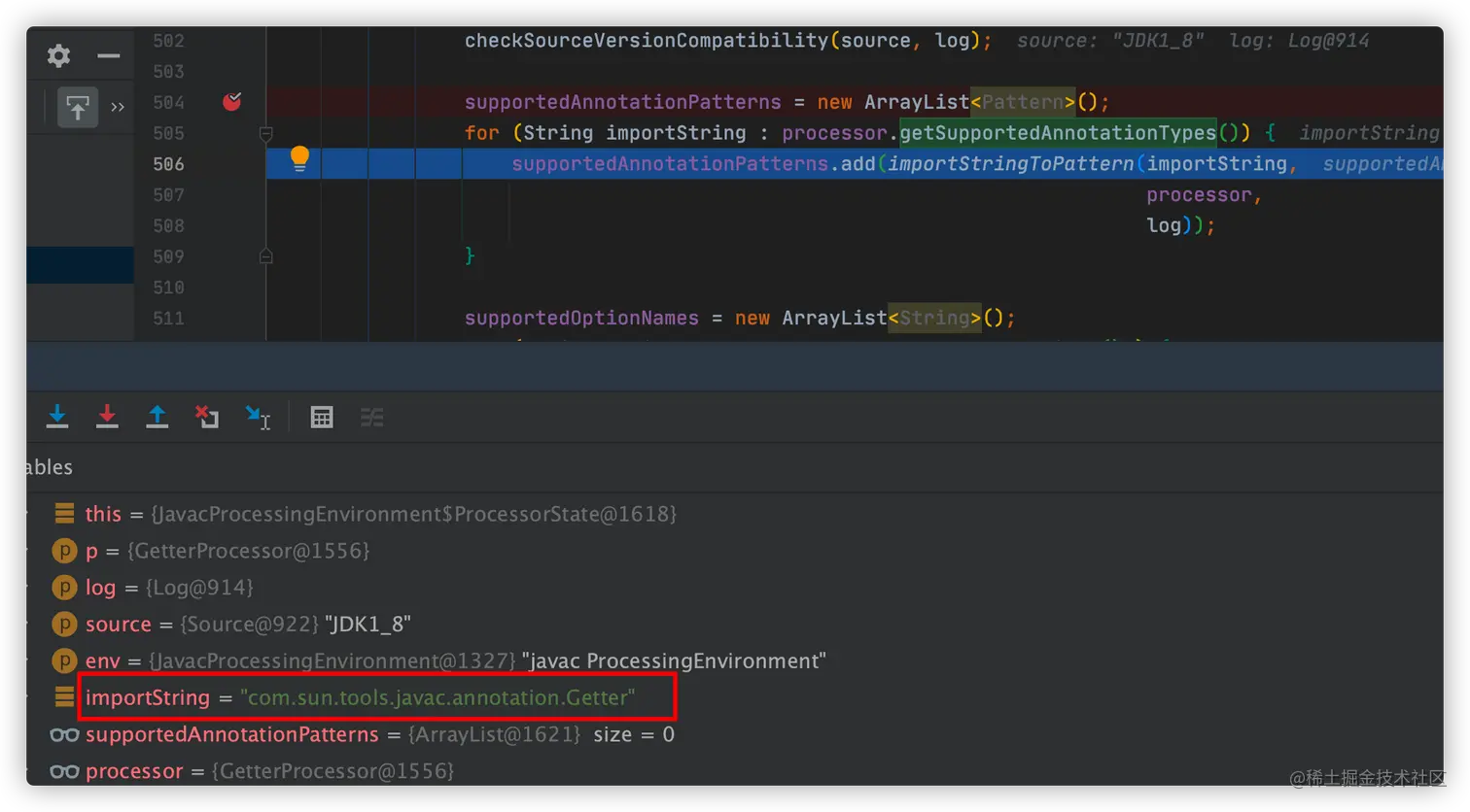 下述断点处,可以看到 getSupportedAnnotationTypes 方法,大致了解处理哪些注解。