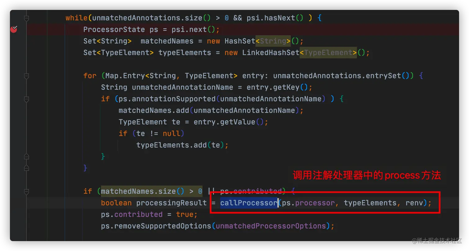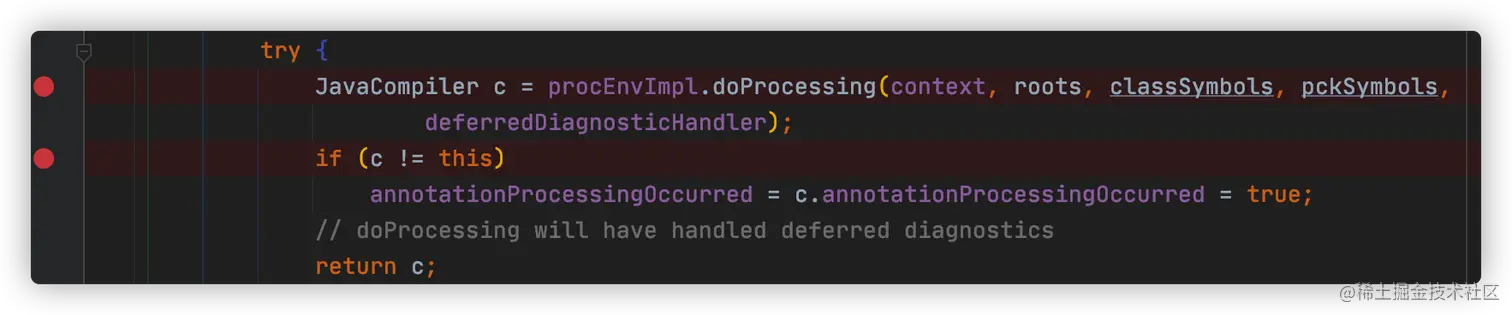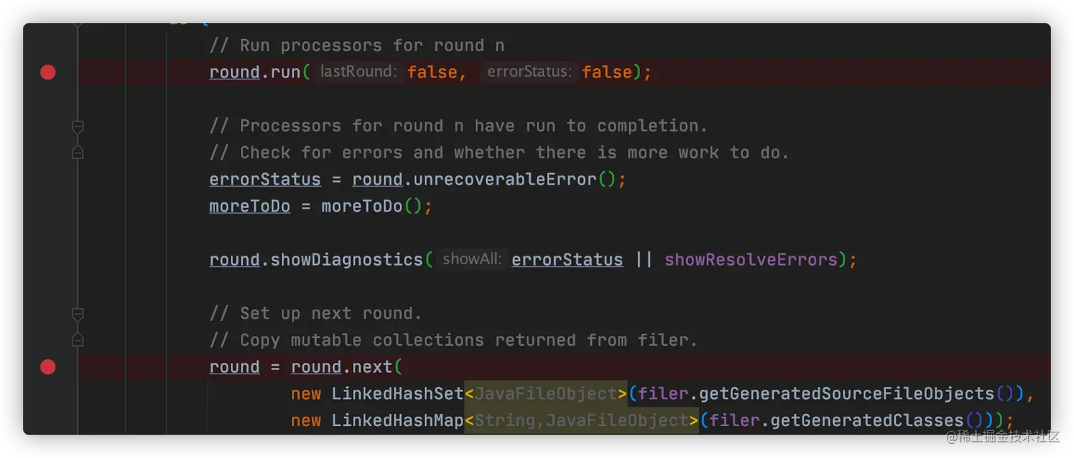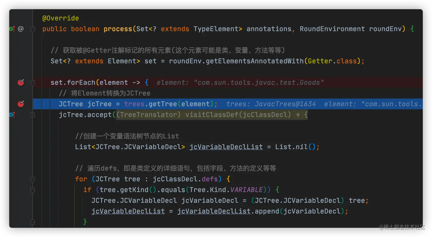 下面只列举几个重要的执行节点,主要集中在 com.sun.tools.javac.processing.JavacProcessingEnvironment 文件和自建的 GetterProcessor 文件。