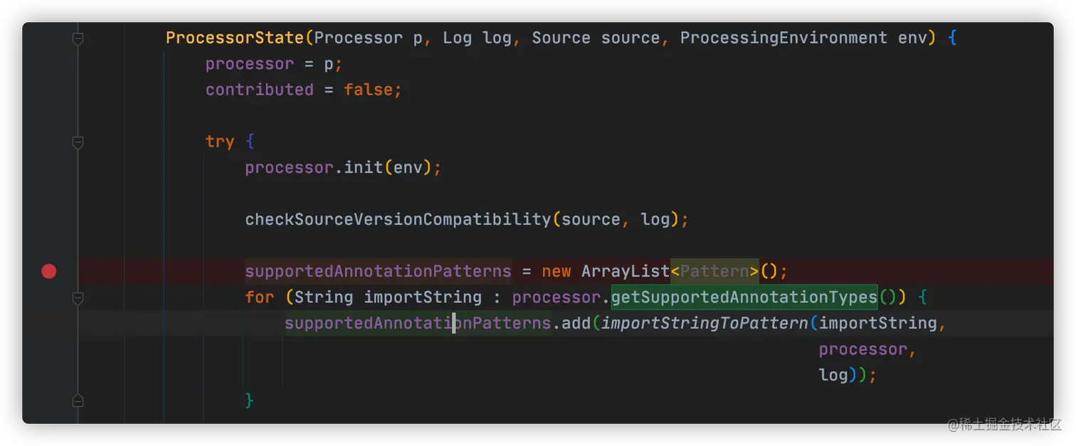 1、首先在 ProcessorState 的构造方法中会调用注解处理器的 init 方法