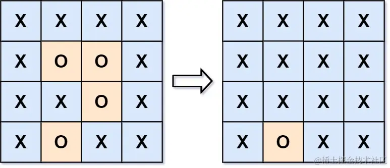 解释: 被围绕的区间不会存在于边界上,换句话说,任何边界上的 'O' 都不会被填充为 'X'。 任何不在边界上,或不与边界上的 'O' 相连的 'O' 最终都会被填充为 'X'。如果两个元素在水平或垂直方向相邻,则称它们是“相连”的。