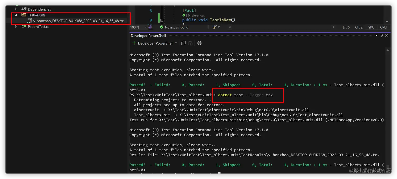 dotnet test --logger trx 在当前目录运行项目中的测试,并以trx格式生成测试结果文件