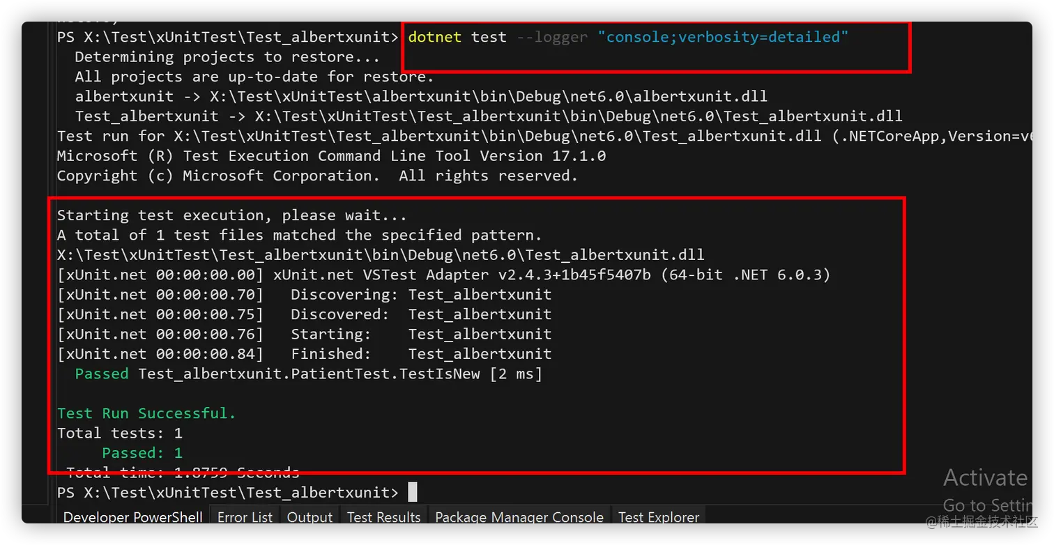 使用命令行将详细日志信息打印出来 dotnet test --logger "console;verbosity=detailed" detailed/minimal