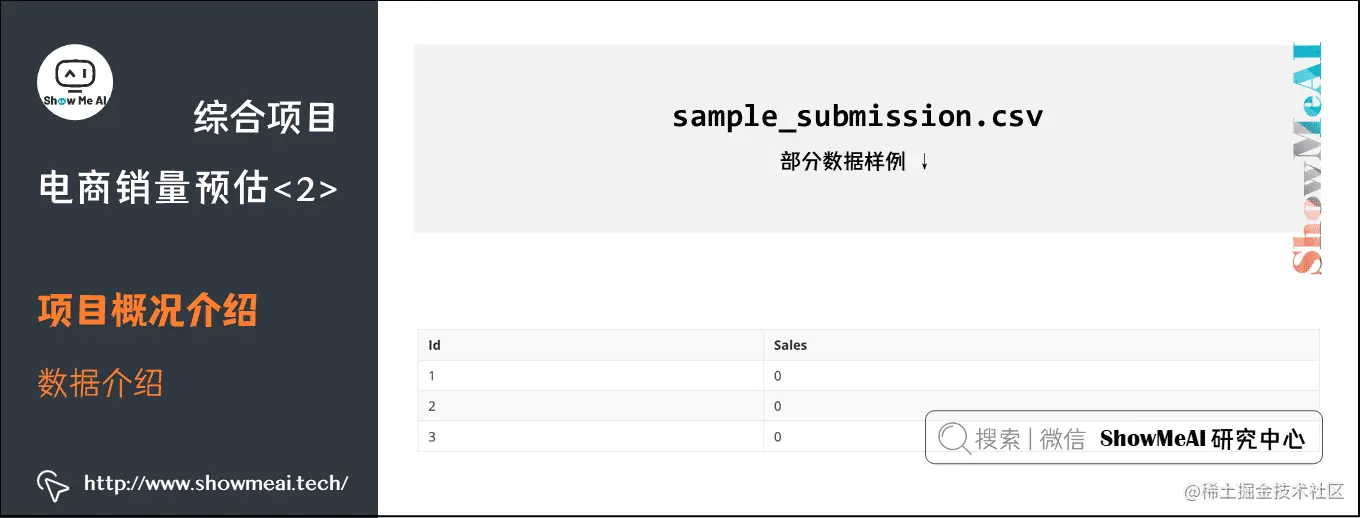 结果文件sample_submission.csv中仅有id与Sales这两列,这个文件是我们将我们的预测答案提交至Kaggle的判题器上的标准格式模板。