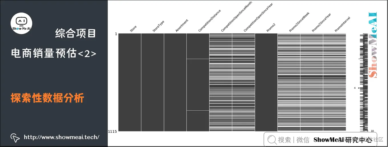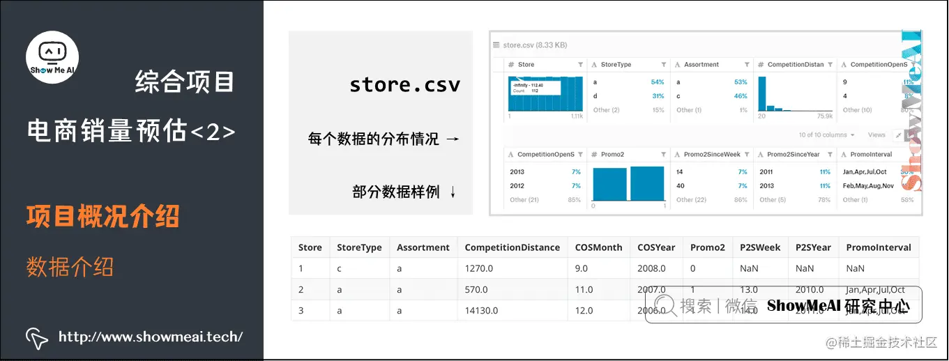 Store:对应表示了店铺的编号。StoreType:店铺的种类,一共有a、b、c、d四种不同种类的店铺。大家可以把它想象成快闪店,普通营业店,旗舰店,或mini店这样我们生活中的类型。Assortment:用a、b、c三种分类描述店铺内售卖产品的组合级别。例如旗舰店和mini店中组合的产品肯定是有很大不同的。Competition Distance、Competition Open Since Year、Competition Open Since Month:分别表示最近的竞争对手的店铺距离,开店时间(以年计算),开店时间(以月计算)。Promo2:描述该店铺是否有长期的促销活动。Promo2 Since Year于Promo2 Since Week:分别表示商店开始参与促销的年份和日历周。Promo Interval:描述promo2开始的连续间隔,以促销重新开始的月份命名。