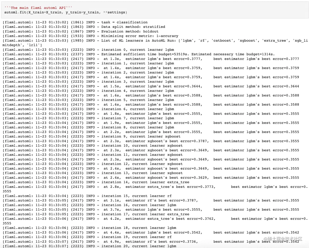 下面我们直接运行 FLAML automl 全自动模式,实际在运行配置中,我们可以指定 任务类型、时间预算、误差度量、学习者列表、是否下采样、重采样策略类型等。 如果不作任何设定的话,所有这些参数都会使用默认值(例如,默认分类器是 [lgbm, xgboost, xgb_limitdepth, catboost, rf, extra_tree, lrl1])。