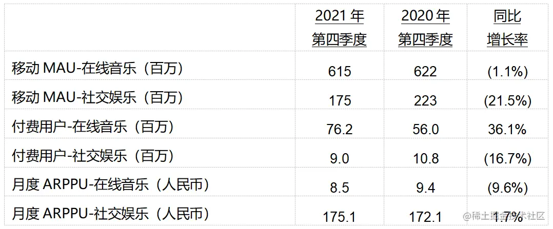 · 2021年第四季度,得益于公司持续拓展的营销渠道、高质量的音乐内容与服务和忠诚的核心用户群体,公司在线音乐付费用户继续实现强劲的同比和环比增长,创下7620万的历史新高,尽管部分轻度用户短暂流失至其他泛娱乐平台导致公司在线音乐MAU同比下降了1%。