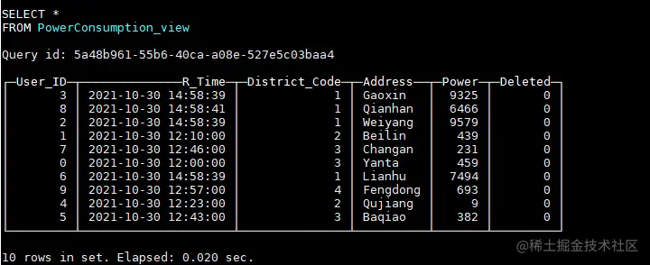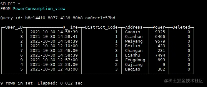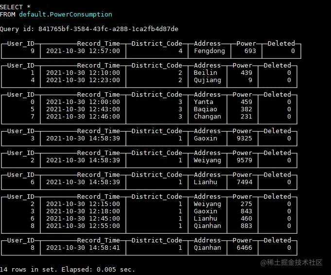 PowerConsumption_local为本地表,PowerConsumption为对应的分布式表。其中PowerConsumption_local使用ReplicatedReplacingMergeTree表引擎,第三个参数‘Record_Time’表示相同主键的多条数据,只会保留Record_Time最大的一条,我们正是利用ReplacingMergeTree的这一特性来实现数据的更新删除。因此,在选择主键时,我们需要确保主键唯一。这里我们选择(User_ID, Address)来作为主键,因为用户ID加上用户的地址可以确定唯一的一个电表,不会出现第二个相同的电表,所以对于某个电表多条数据,只会保留电量记录时间最新的一条。