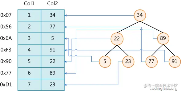 图1展示了一种可能的索引方式。左边是数据表,一共有两列七条记录,最左边的是数据记录的物理地址(注意逻辑上相邻的记录在磁盘上也并不是一定物理相邻的)。为了加快Col2的查找,可以维护一个右边所示的二叉查找树,每个节点分别包含索引键值和一个指向对应数据记录物理地址的指针,这样就可以运用二叉查找在O(log2n)的复杂度内获取到相应数据。