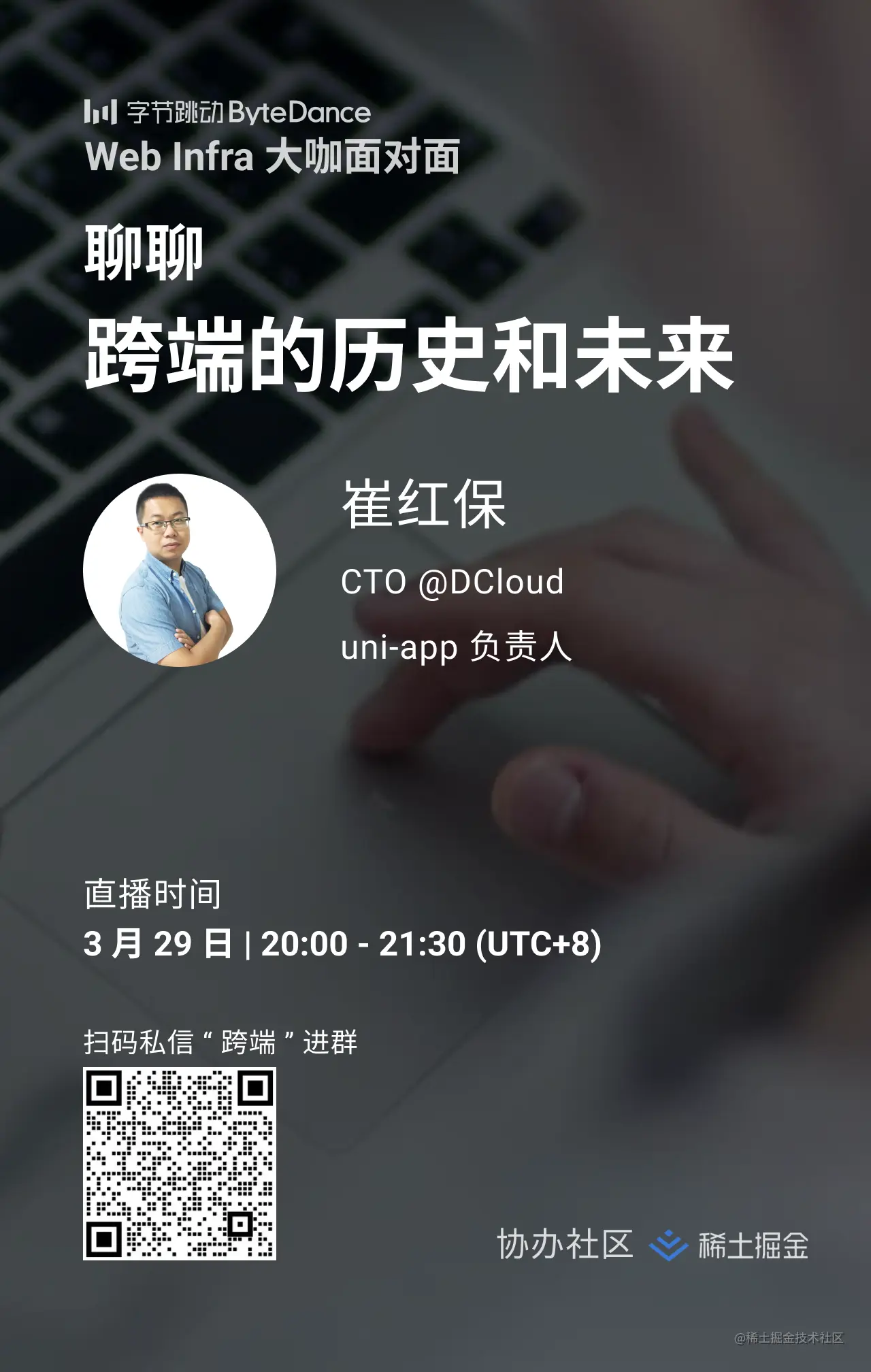 本期 Web Infra 大咖面对面邀请了 uni-app 的负责人崔红保来跟大家聊一聊跨端的历史和未来~
