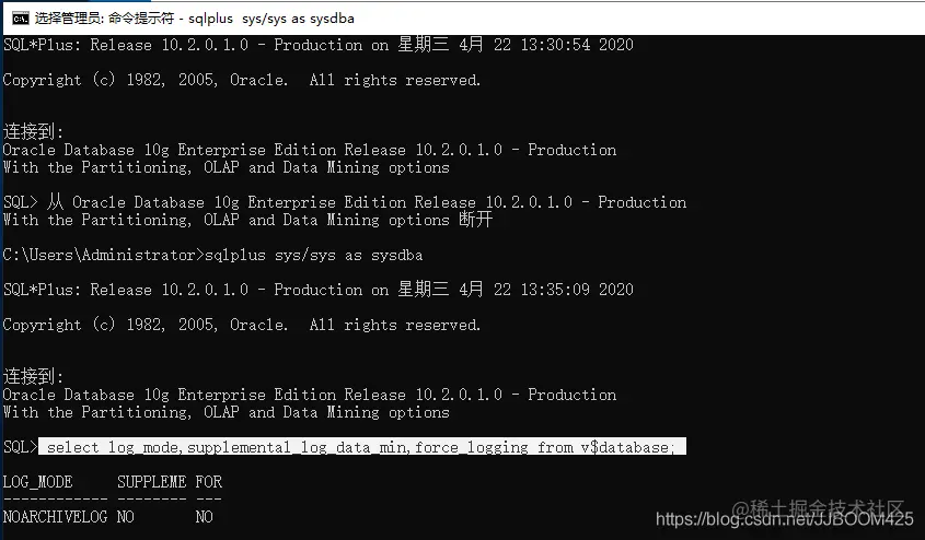 检查归档模式、附加日志、强制日志参数是否开启。Oracle 10g要检查回收站功能是否关闭,11g则不必检查。这里使用的是10g的,所以需要通过以下指令检查。