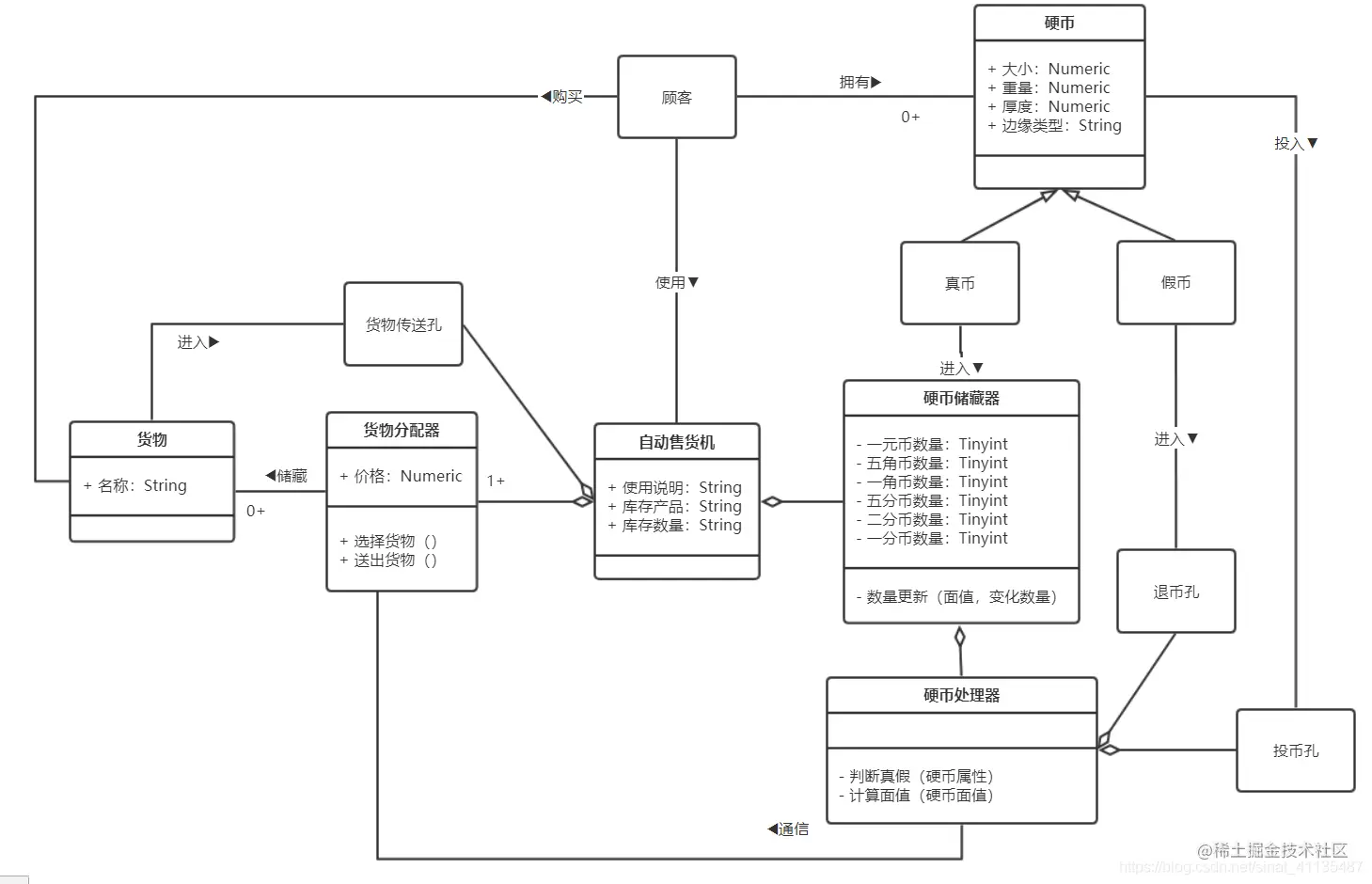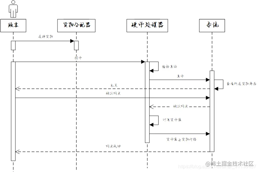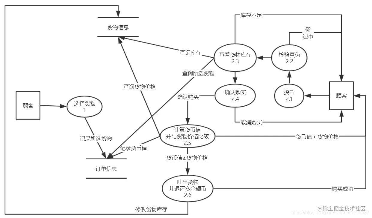 自动售货机装有货物分配器。每个货物分配器中包含零个或多个价格相同的货物。顾客通过选择货物分配器来选择货物。如果货物分配器中有货物,而且顾客支付的货币值不小于该货物的价格,货物将被分配到货物传送孔送给顾客,并将适当的零钱返回到退币孔。如果分配器是空的,则和顾客支付的货币值相等的硬币将被送回到退币孔。如果顾客支付的货币值少于所选择的分配器中货物的价格,机器将等待顾客投进更多的货币。如果顾客决定不买所选择的货物,他投放进的货币将从退币孔中退出。