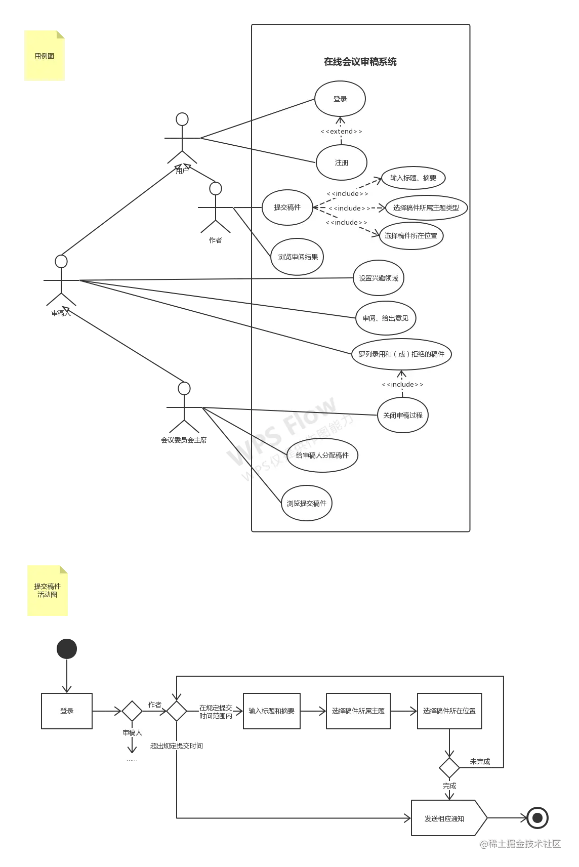 试据此描述画出该系统的UML用例图和作者提交稿件过程的活动图。