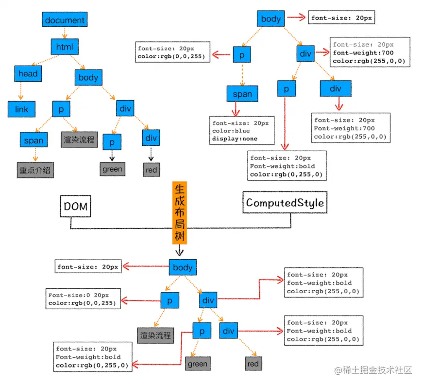 - 接下来,就是计算出DOM树每个节点的具体样式。进行样式计算时需要遵循两个规则:继承和层叠,继承就是基层父节点的样式,层叠是指合并多个源的属性值的算法。