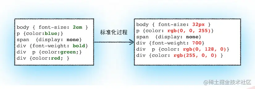 - 我们经常用到1em,blue, bold这样的值,其实渲染引擎是 不理解这些值的,所以就需要进行标准化计算,如下图。