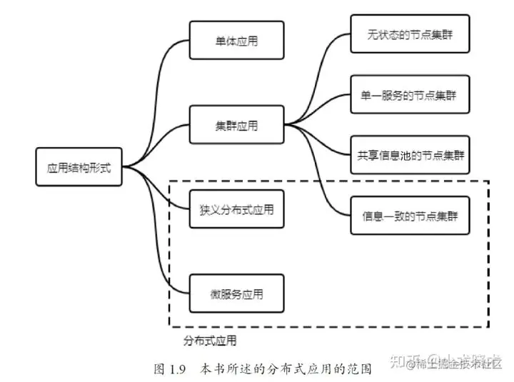 “分布式系统”也常被称为“分布式应用”,包含了信息一致的节点集群、狭义分布式应用、微服务应用三大类,如图1.9所示。
