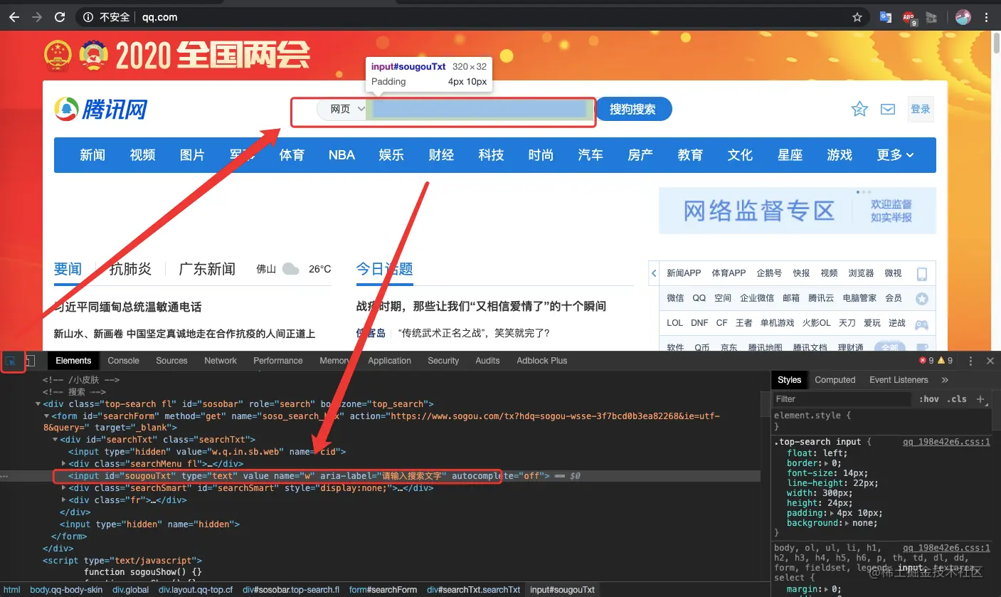 大致了解了HTML的结构组成,接下来使用开发者工具来查找网页元素。比如查找腾讯网的搜索框在HTML里所在的位置,我们可以单击开发者工具的“小箭头按钮”按钮,然后将鼠标移到网页上的搜索框并单击,最后在Elements标签页里自动显示搜索框在HTML里的元素信息,具体操作如图: