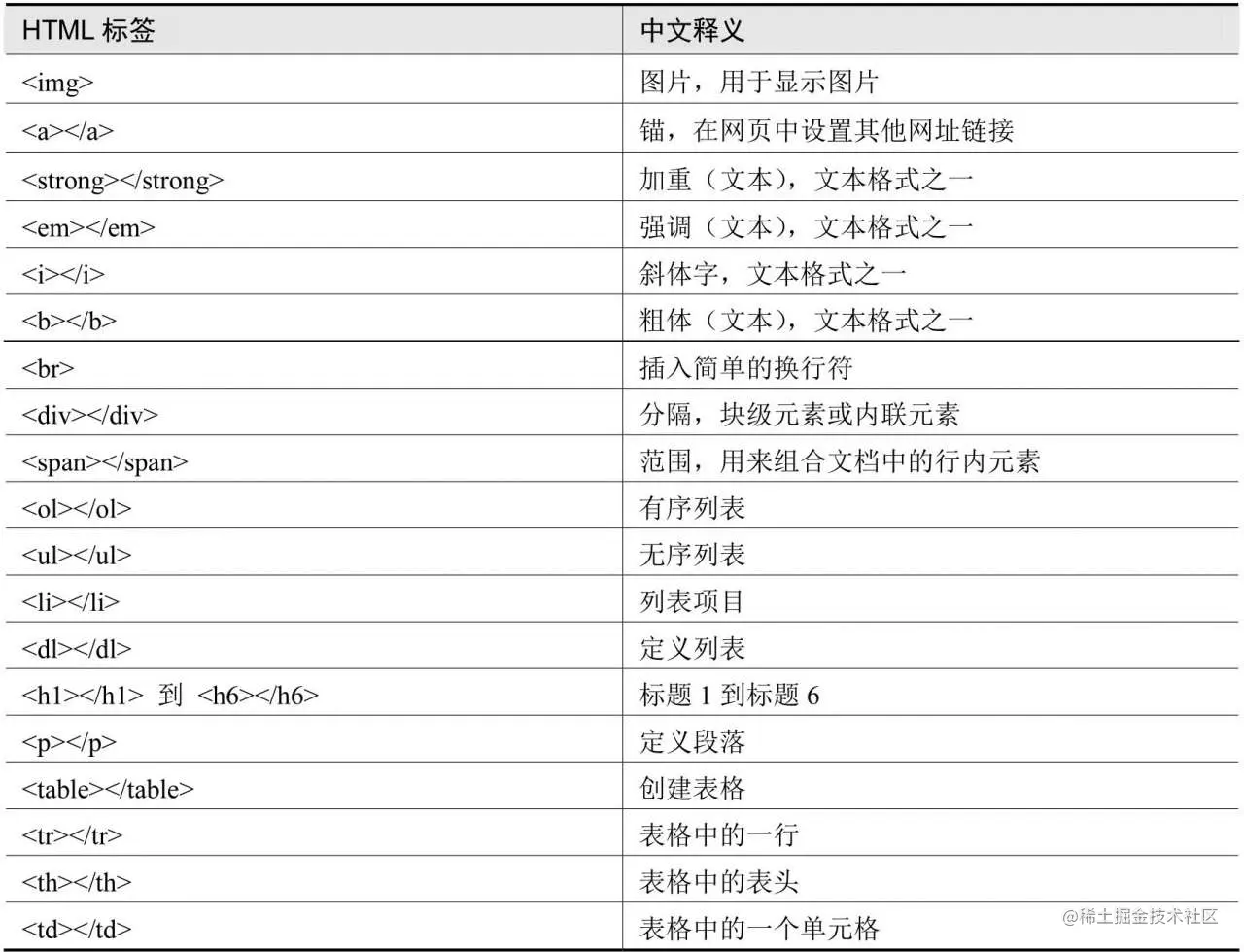 除上述示例的标签之外,大部分标签都可以在中使用,常用的标签如下表: