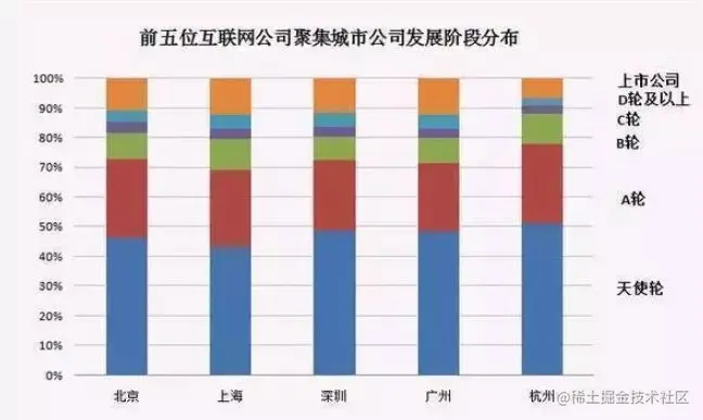 选取了互联网公司最集中,排名前五的城市,可以看到,上海的非天使轮公司占比最多,上市公司占比也最高,表明上海的创业公司发展还不错,准备创业的小伙伴们可以考虑以上海作为创业地。