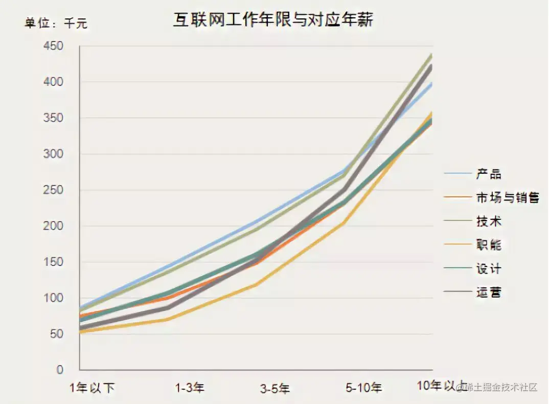 上图可以看到,前5年里,技术和产品类别的职位年薪属于互联网行业中较高的群体,工作5年后,运营类别的职位年薪有了较大的涨幅,后期甚至超过了做产品的人员。职能部门的人员前期薪酬相对较低,工作10年以上,薪酬和市场,设计相关职位人员达到同一层次。