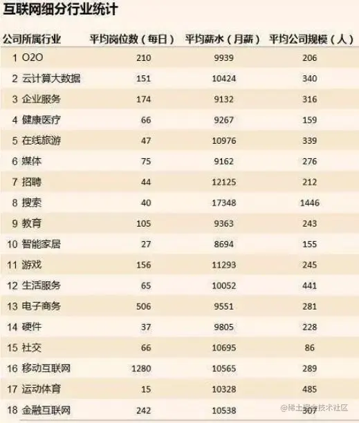 根据互联网公司的细分行业,我对每个行业互联网公司的每日平均岗位数,平均月薪,平均公司规模进行了统计,可以看到,移动互联网,搜索,大数据和游戏行业的公司发展都不错,薪酬待遇相应也属于行业的前列。