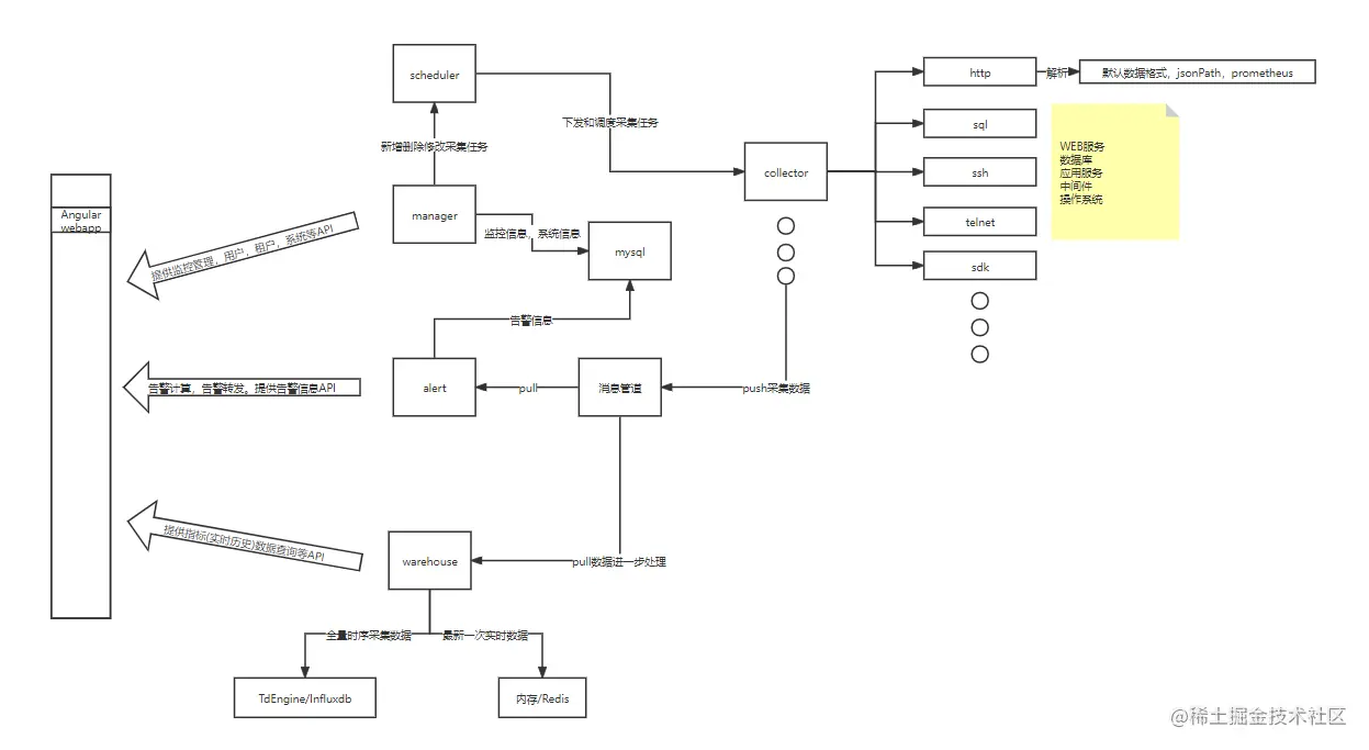 HertzBeat 赫兹跳动的模块化包括 manager、collector、scheduler、warehouse、alerter 各个模块解耦合。