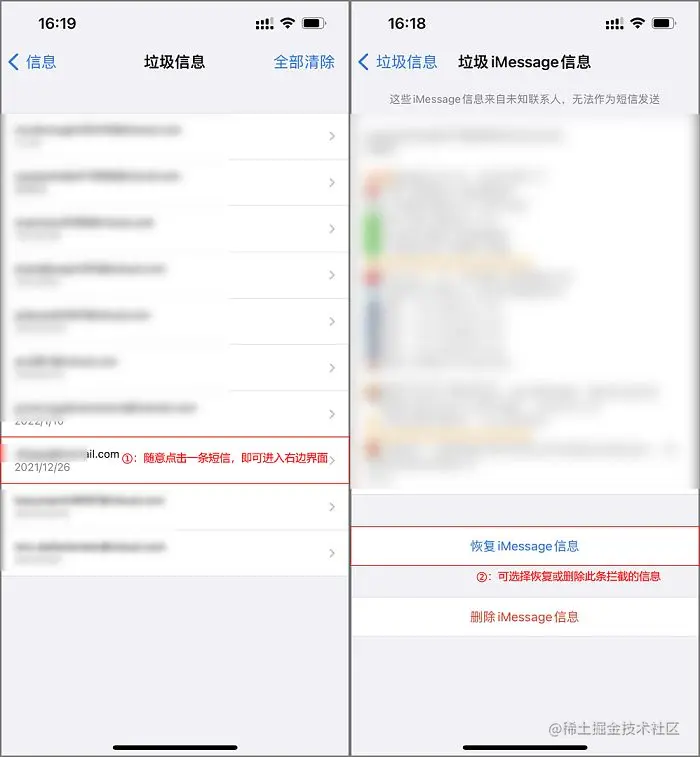 步骤2:进入【垃圾短信】后可查看到一些被拦截到的短信,可一个一个的查看拦截中的短信,最后可根据自己的需求来决定是否需要恢复到短信当中。