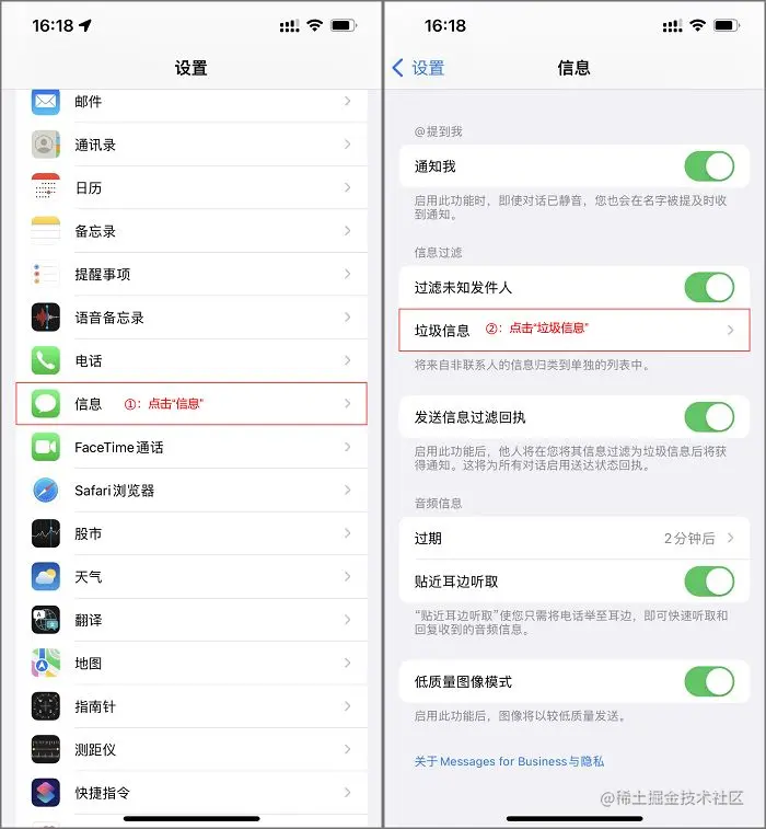 步骤1:打开设置,往下找到【信息】后点击,再往下找到【垃圾信息】;