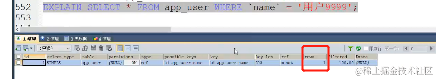 -- 下图执行结果,rows = 1,执行1行即找到它