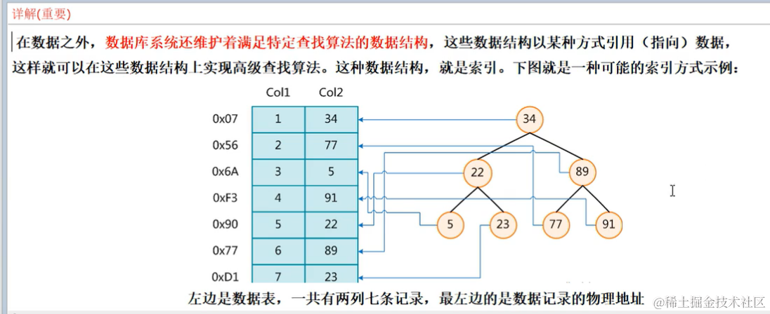 右边(二叉树)可以看做是索引的一种方式:查询第一个比大小,小了往左找,再比大小,大了往右边找,找三次就能找到。