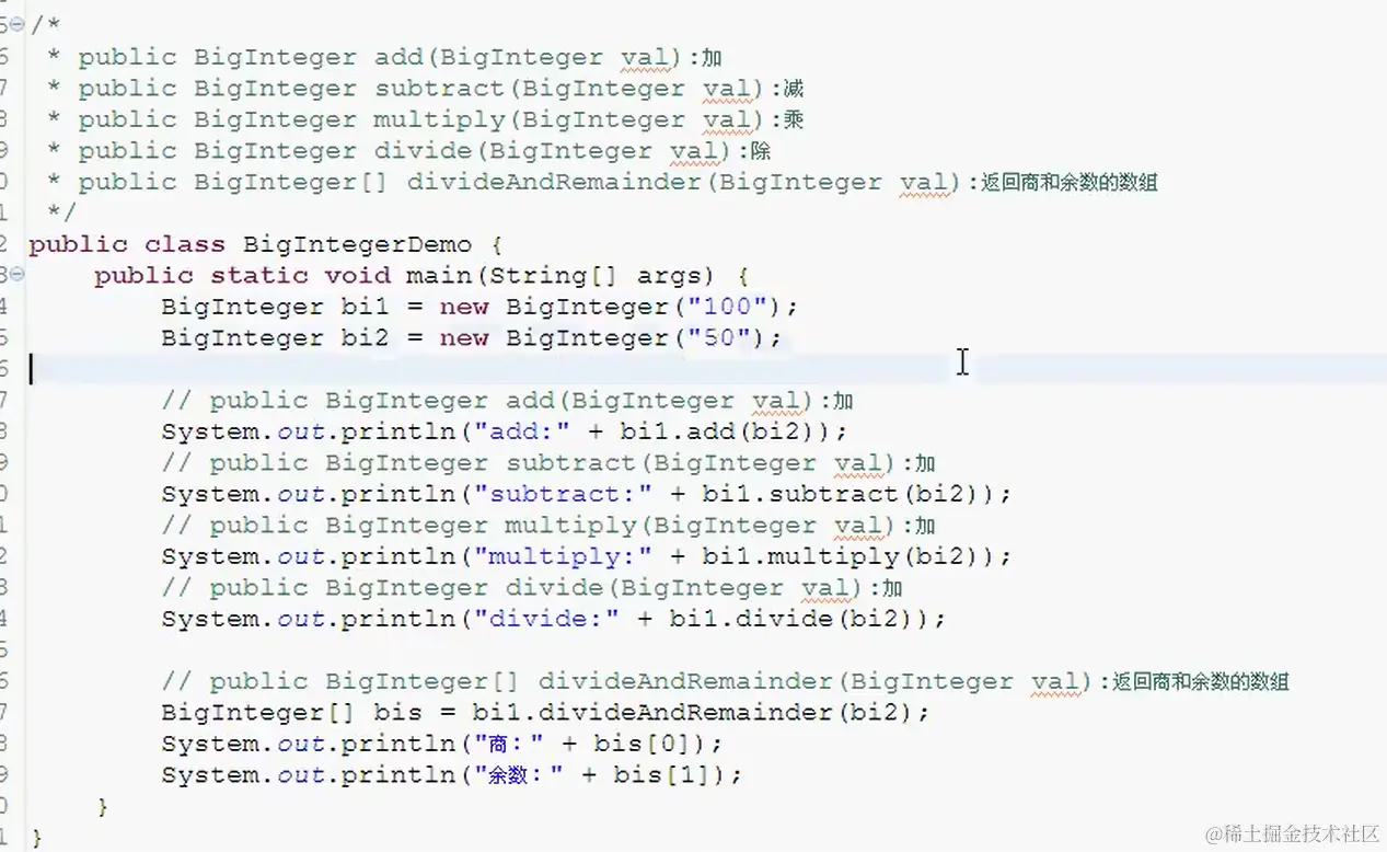 不可变的任意精度的整数。所有操作中,都以二进制补码形式表示 BigInteger(如 Java 的基本整数类型)。BigInteger 提供所有 Java 的基本整数操作符的对应物,并提供 java.lang.Math 的所有相关方法。另外,BigInteger 还提供以下运算:模算术、GCD 计算、质数测试、素数生成、位操作以及一些其他操作。